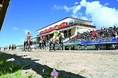 據(jù)了解,今年主辦方從青海等地邀請了特色高原馬種前來展示?;顒蝇F(xiàn)場,記者看到,騎手們身著民族服飾,英姿颯爽;駿馬裝飾五色綢帶,躍躍欲試;觀眾扶老攜幼,笑逐顏開。今年的賽馬節(jié)還新增了馬上刀術(shù)、馬上烏爾朵、騎馬射擊、騎馬拾哈達等四項賽馬競技活動。
