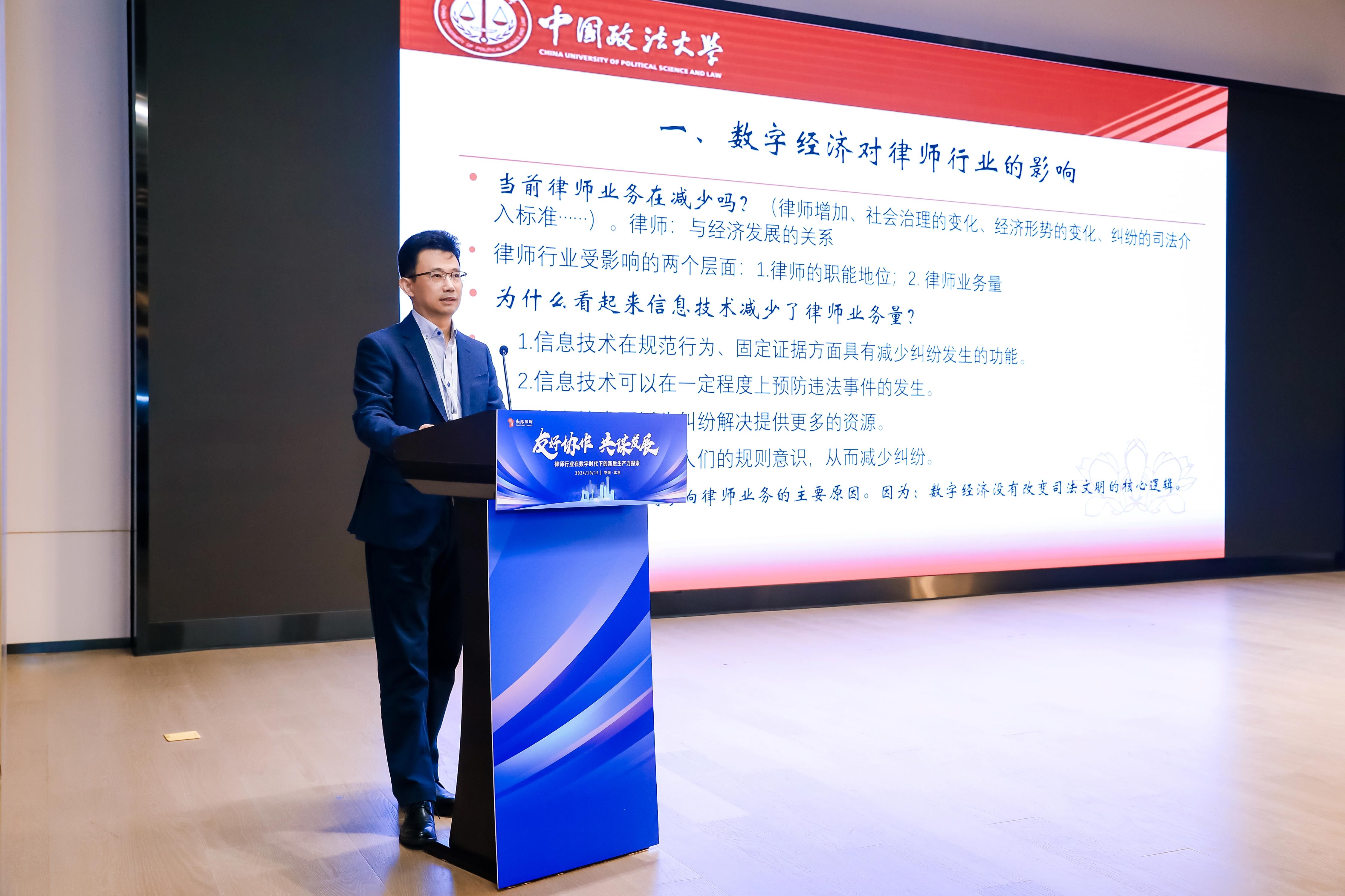 研討會上,中國政法大學博士生導師、教授范明志,北京市朝陽區(qū)律師協(xié)會會長劉光超分別以《數(shù)字經濟時代律師行業(yè)面臨的挑戰(zhàn)和機遇》《構建協(xié)會工作新格局推動律師行業(yè)規(guī)范健康發(fā)展》為題,進行了精彩的主旨演講。