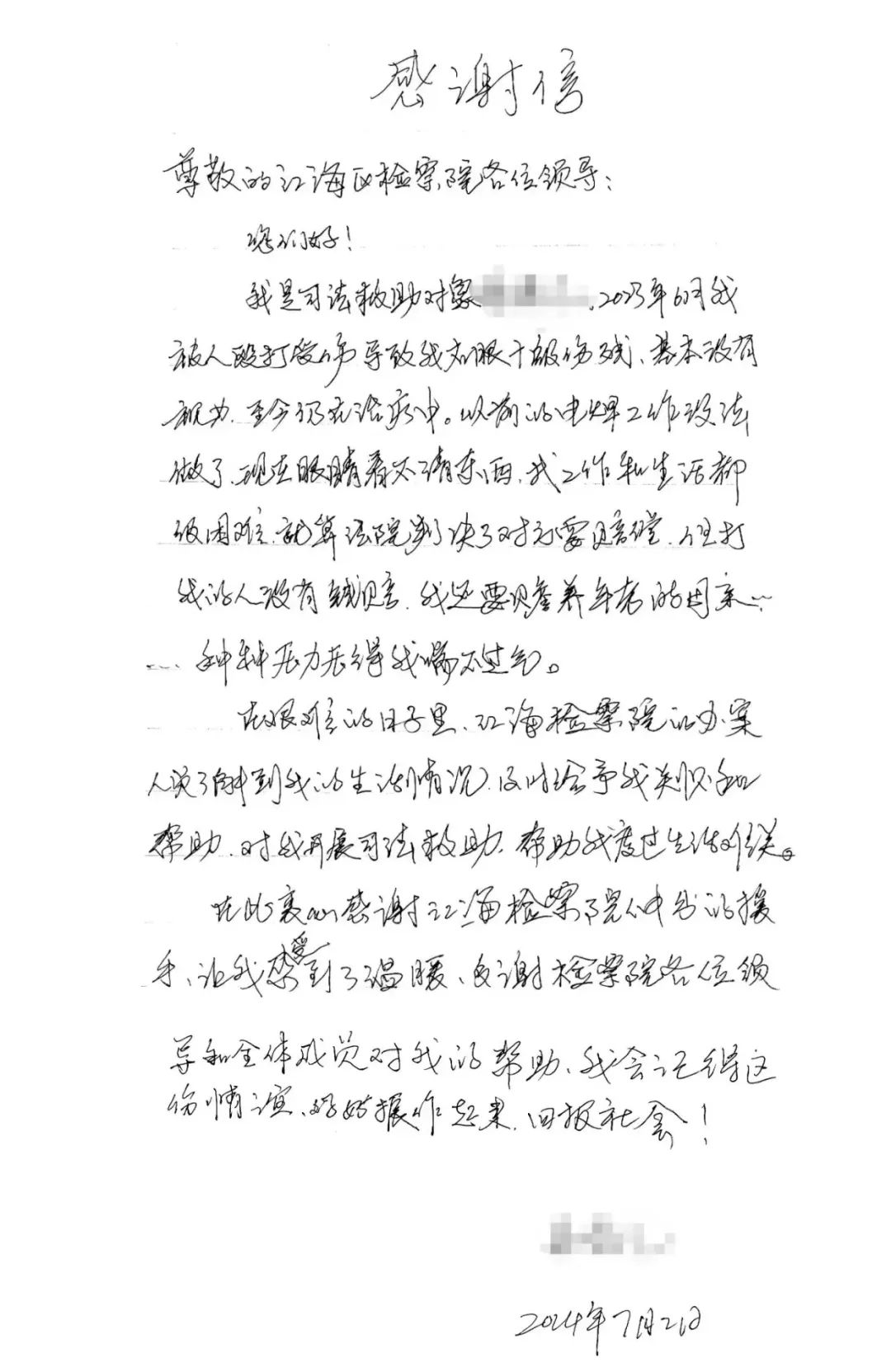 司法救助當事人的感謝信