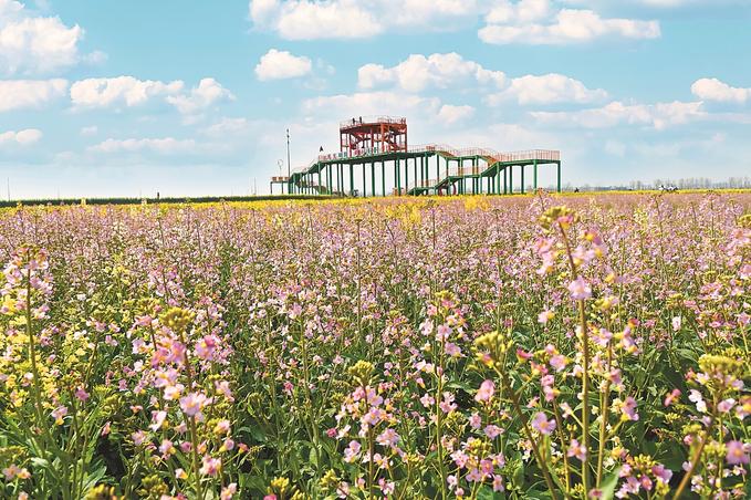 烏篷船劃過(guò)粼粼波光,復(fù)古小火車穿梭于花田間……如果說(shuō)興化萬(wàn)畝垛田花海是“壘土成垛”而來(lái),那么高郵湖上油菜花田則是“化荒灘為金?!?。高郵農(nóng)文旅集團(tuán)董事長(zhǎng)劉玲介紹,2018年,高郵啟動(dòng)新民灘生態(tài)修復(fù)工程,將荒廢湖灘打造成全國(guó)首個(gè)湖上油菜花田。依托高郵湖的濕地生態(tài),花海與鴨文化、漁文化深度融合,形成獨(dú)特景觀。