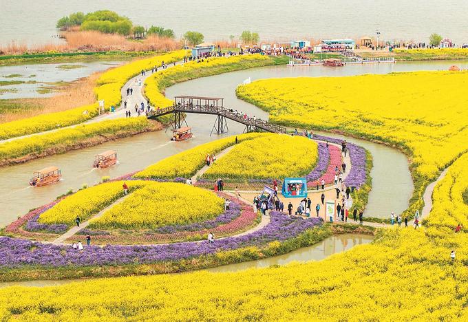 在蘇中,興化、高郵、如皋三市都不約而同“偏愛(ài)”油菜花。在興化千垛景區(qū),萬(wàn)畝垛田花海演繹“河有萬(wàn)灣多碧水,田無(wú)一垛不黃花”;在高郵湖上花海,“半城花海半城詩(shī)”的獨(dú)特景觀,吸引了眾多游客;在如皋平園池村,五彩油菜花好似打翻春日“調(diào)色盤”……