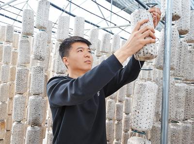 李強在木耳大棚里檢查菌包。張超 攝