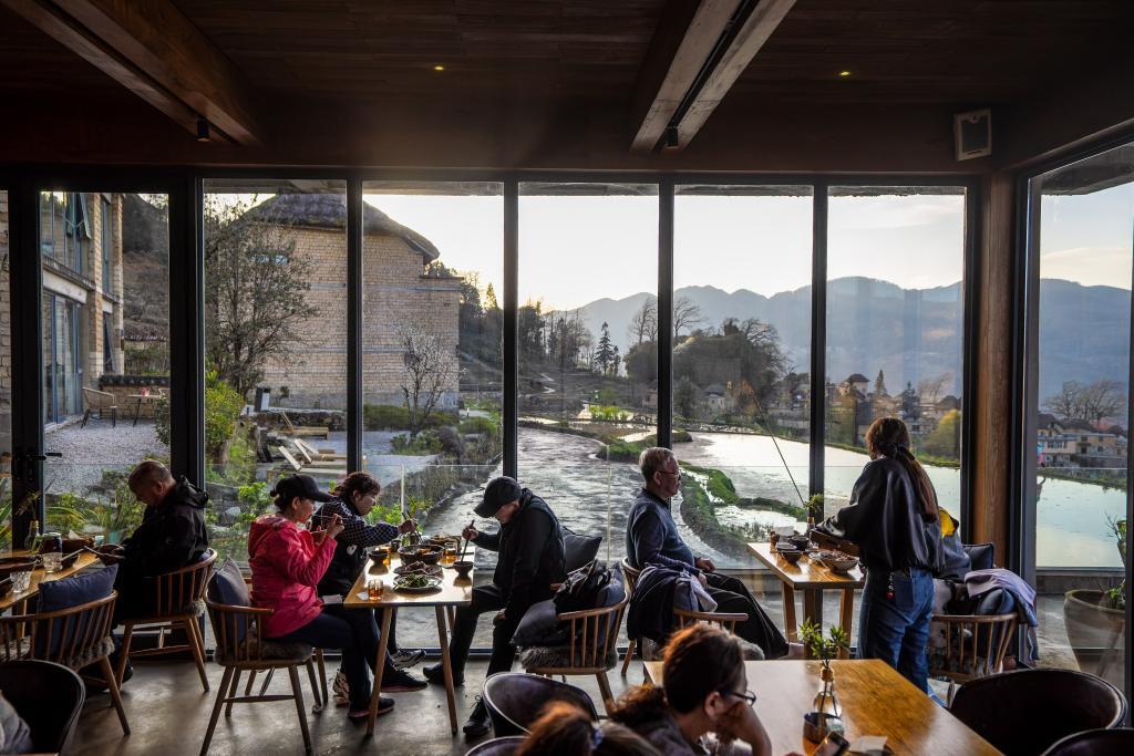 2月27日,在云南省元陽縣阿者科村,游客在村民開的民宿餐廳吃晚餐。記者 胡超 攝