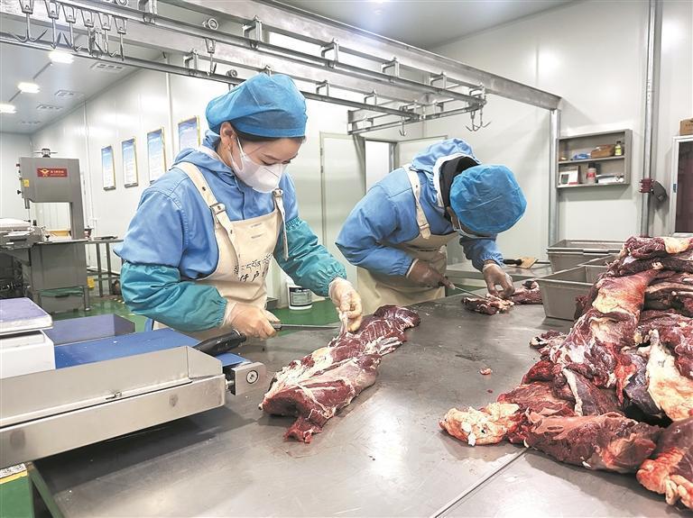 “一只成年藏羊在經(jīng)過(guò)檢疫達(dá)標(biāo)屠宰后,先送至排酸間用保鮮排酸技術(shù)進(jìn)行排酸,再被送進(jìn)這里分割加工、剔骨、修割?!鼻獞?hù)牧場(chǎng)加工車(chē)間工作人員馬玉梅介紹說(shuō)。只見(jiàn)她手持專(zhuān)用刀具,沿著羊肉的肌肉紋理精準(zhǔn)下刀,將藏羊按部位分割成精品羊肋排、羊腿肉(帶骨)、羊脖片等不同區(qū)塊。隨后,新鮮的藏羊肉被快速分揀至不同區(qū)域,有的進(jìn)入真空包裝機(jī)完成封裝,有的則被送往進(jìn)一步加工的流水線。車(chē)間里機(jī)器運(yùn)轉(zhuǎn)的低鳴聲與工作人員專(zhuān)注的動(dòng)作交織,每一個(gè)環(huán)節(jié)都嚴(yán)格遵循衛(wèi)生標(biāo)準(zhǔn),確保肉類(lèi)從分割到成品的全程安全。