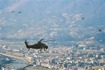 “計時起飛。”上午8時,隨著塔臺指揮員一聲令下,30余架多型號直升機從閩南某機場騰空而起,直奔預(yù)定空域,拉開訓(xùn)練帷幕。
