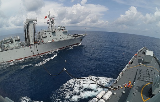 圖為巢湖艦為太原艦實施油料補給。江山 攝