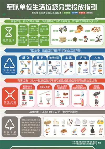 2017年,《關(guān)于軍隊(duì)單位落實(shí)生活垃圾分類制度的意見(jiàn)》印發(fā)。明確對(duì)于駐地已實(shí)施強(qiáng)制分類制度的軍隊(duì)單位,要積極主動(dòng)配合當(dāng)?shù)赜嘘P(guān)部門(mén),堅(jiān)決落實(shí)生活垃圾強(qiáng)制分類制度和駐地有關(guān)要求,積極做好營(yíng)區(qū)生活垃圾分類工作。對(duì)于駐地尚未實(shí)施生活垃圾強(qiáng)制分類制度的軍隊(duì)團(tuán)以上機(jī)關(guān)、院校、科研和醫(yī)療單位,要率先開(kāi)展生活垃圾強(qiáng)制分類工作;其他單位應(yīng)當(dāng)按照要求,以及駐地人民政府制定的生活垃圾分類指南,自覺(jué)穩(wěn)步地開(kāi)展生活垃圾分類。2019年,在北京地區(qū)組織開(kāi)展5個(gè)生活垃圾分類示范營(yíng)區(qū)建設(shè)。