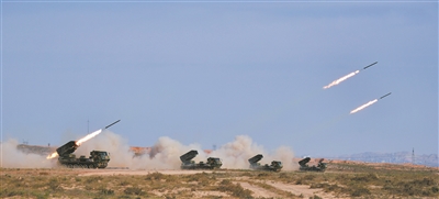 炮火封鎖、空中偵察……“敵”情接踵而至,紅方裝甲兵、炮兵、工兵等多兵種密切協(xié)同,迅速占領(lǐng)有利打擊陣位?!叭B射擊,101號目標(biāo)火力點……”紅方指揮員一聲令下,某自行火箭炮炮手快速校對標(biāo)尺、高低和方向,精準(zhǔn)鎖定“敵”目標(biāo)。炮聲響起,一枚枚火箭彈射向目標(biāo),一時間,戈壁深處烽煙四起。