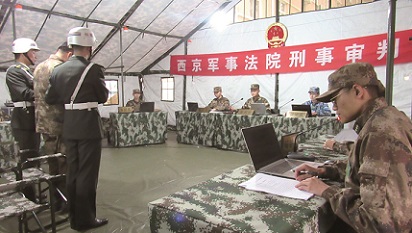 風雨中,戰(zhàn)時自傷案件的軍事刑事審判正在野戰(zhàn)帳篷中緊張進行,控辯雙方激烈交鋒。突然,一陣空襲警報響起,戰(zhàn)時審判庭馬上臨時休庭,全體人員緊急疏散隱蔽。
