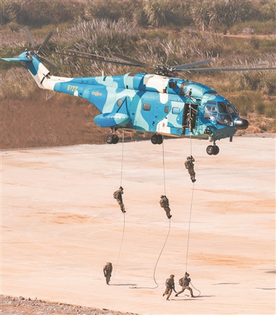 鐵翼飛旋,黃沙漫卷。突擊隊員在“敵”左右兩翼,多方向、多批次快速實施索降和機降。