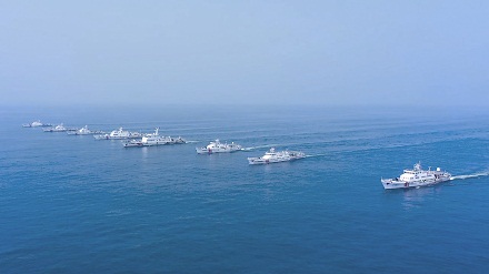 汕頭、揭陽、潮州海警局艦艇編隊(duì)單橫隊(duì)型航行。