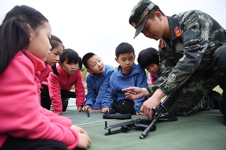 圖為武警合肥支隊(duì)執(zhí)勤一大隊(duì)?wèi)?zhàn)士向孩子們演示武器操作。
