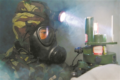 官兵在全防護狀態(tài)下訓練。