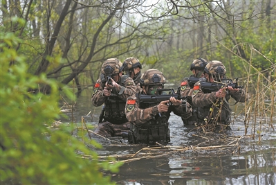 特戰(zhàn)隊員涉水搜索目標(biāo)。