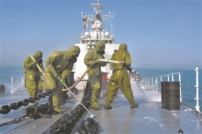 “發(fā)現(xiàn)有毒氣體,人員注意隱蔽!”青島艦拉響戰(zhàn)斗警報(bào),各戰(zhàn)位人員迅速穿戴好防護(hù)裝具。防化分隊(duì)聞令而動(dòng),對(duì)艦艇重要部位進(jìn)行局部洗消。待艦艇高速駛離“染毒”區(qū)域后,立即打開(kāi)水幕進(jìn)行全艦洗消。