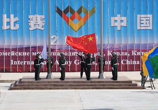 圖為8月22日,“國際軍事比賽-2021”中國庫爾勒賽區(qū)在“蘇沃洛夫突擊”比賽場正式開幕,會場上升起中華人民共和國國旗。張永進 攝