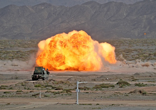 圖為8月22日,“國際軍事比賽-2021”中國庫爾勒賽區(qū)在“蘇沃洛夫突擊”比賽場正式開幕,軍事課目演示中綜合掃雷車進行實彈射擊。羅興倉 攝