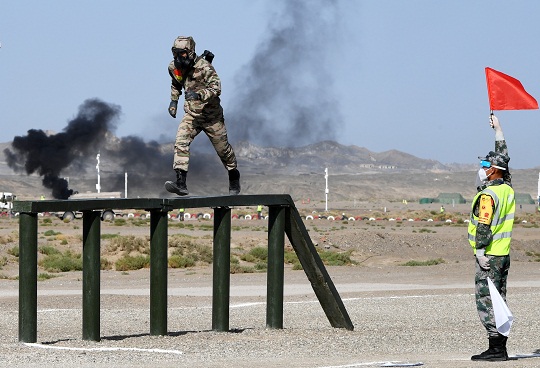 圖為“安全環(huán)境”項(xiàng)目舉行接力賽,中國(guó)陸軍參賽隊(duì)隊(duì)員通過(guò)獨(dú)木橋。 張永進(jìn) 攝