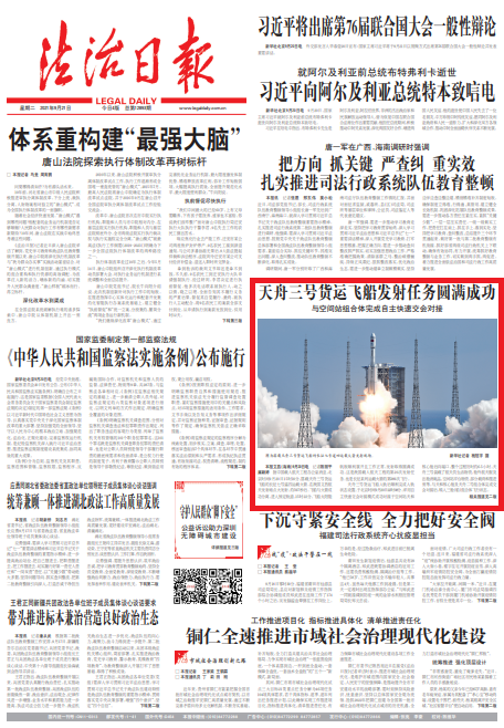 天舟三號(hào)貨運(yùn)飛船入軌后順利完成入軌狀態(tài)設(shè)置,于北京時(shí)間9月20日22時(shí)08分,采用自主快速交會(huì)對(duì)接模式成功對(duì)接于空間站天和核心艙后向端口,整個(gè)過(guò)程歷時(shí)約6.5小時(shí)。天舟三號(hào)裝載了航天員生活物資、艙外航天服及出艙消耗品、空間站平臺(tái)物資、部分載荷和推進(jìn)劑等,與天和核心艙及天舟二號(hào)組合體完成交會(huì)對(duì)接后,轉(zhuǎn)入三艙(船)組合體飛行狀態(tài)。