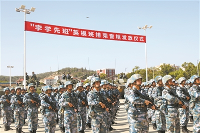 “賡續(xù)光榮傳統(tǒng),爭做‘李學(xué)先班’傳人……”軍委政治工作部為獲得重大榮譽(yù)的英模班排制作的榮譽(yù)柜下發(fā)部隊(duì)后,海軍陸戰(zhàn)隊(duì)某旅第一時(shí)間舉行榮譽(yù)柜發(fā)放儀式,為前身為“李學(xué)先班”的機(jī)步四連二班發(fā)放榮譽(yù)柜。