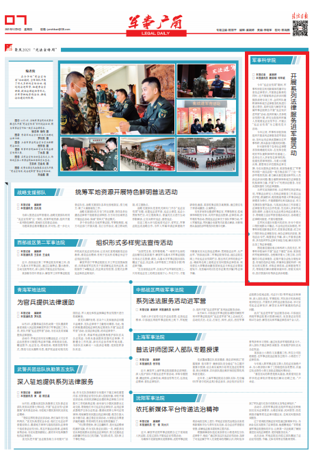 在軍民共建鄉(xiāng)村振興的農(nóng)村,針對個別對口幫扶地群眾不懂法、不會用法的實際情況,軍事科學院創(chuàng)新普法形式,拓寬普法渠道,成立對口幫扶單位法律服務站,舉辦法律知識講座、策劃法治專欄、購置普法書籍,深入開展普法教育。多次組織軍隊法律專家赴當?shù)?,解決村民外出務工等法律難題。