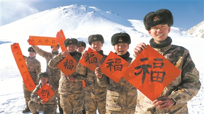 圖②:戰(zhàn)士們自寫春聯(lián)和“?!弊钟有麓杭压?jié)的到來。