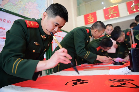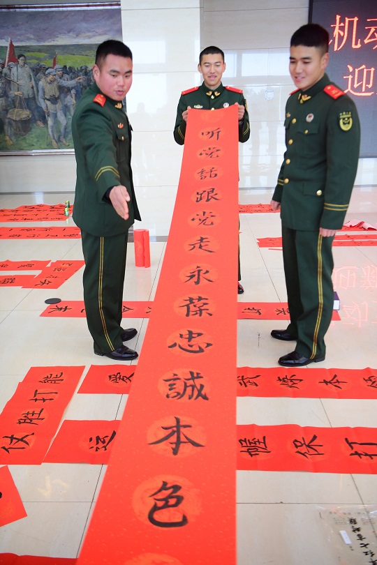 1月27日,武警江西總隊機動支隊組織書法愛好者為基層大、中隊官兵寫春聯(lián)、送福字,喜慶祥和迎春節(jié)。