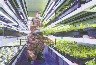 圖為官兵在“植物工廠”采摘蔬菜。李海亮 攝