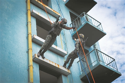 圖③:武警江西總隊(duì)新余支隊(duì)特戰(zhàn)隊(duì)員進(jìn)行樓房索降突入訓(xùn)練。曾凡鵬 攝