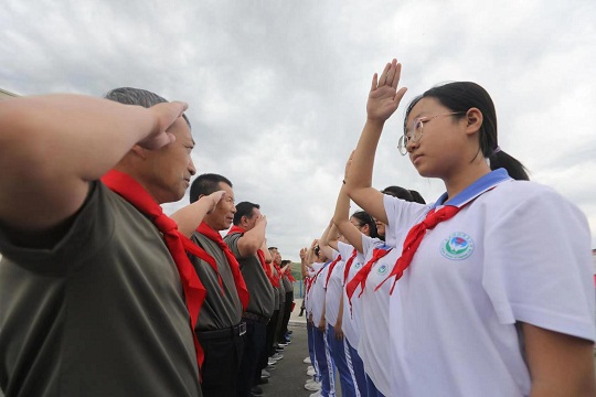 國門之下,革命老兵高舉右拳,神色堅毅,鏗鏘有力的誓言發(fā)自肺腑,“我志愿加入中國共產(chǎn)黨,擁護(hù)黨的綱領(lǐng),遵守黨的章程……”一字一句,莊嚴(yán)而神圣,面對鮮紅的黨旗,他們?nèi)詧允刂鴰资昵靶臅r的那顆初心,他們把自己的“紅色芳華”,獻(xiàn)給了革命事業(yè)。深受感動的學(xué)生們用最真摯的情感唱響紅歌,用最崇高的敬意為革命老兵戴上紅領(lǐng)巾,革命老兵也回敬標(biāo)準(zhǔn)的軍禮,承載著初心和使命的革命精神跨越時空,根植在學(xué)生們的心中?!皞鞒惺亲詈玫闹戮?,學(xué)生們只有堅守初心,傳承老一輩革命精神,好好學(xué)習(xí),做一個對國家有用的人,才能不負(fù)重托、不負(fù)期盼?!睘跆m浩特市第五中學(xué)教師王向英表示。