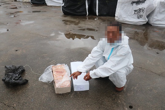 經(jīng)過2個多小時的搜索,海警巡邏艦成功在目標海域發(fā)現(xiàn)嫌疑船只,海警執(zhí)法員隨即依法進行登船檢查。經(jīng)查,該嫌疑船船倉內(nèi)裝有大量黑色及白色塑料袋,袋內(nèi)裝有疑似來自境外的凍豬耳、凍豬肚等凍品約190噸,現(xiàn)場抓獲3名嫌疑人,且隨船未能找到該批凍品的任何合法來源證明。