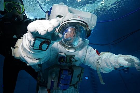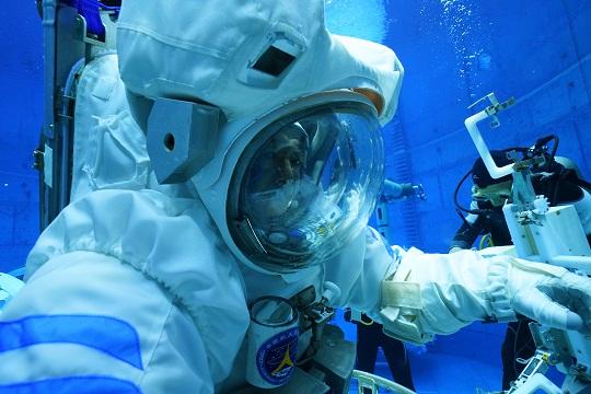 在圓形的模擬失重水槽中,航天員穿著數(shù)百公斤的水下服懸浮在藍色深水中。水下訓練服相當于一個“人”形飛船,是個鋼性結(jié)構(gòu),張陸的肩比較寬,每次把自己的兩只胳膊塞進服裝里或者出服裝,都要費盡九牛二虎之力。在水里一待就是五六個小時,整個人的四肢被固定在水下服里,癢了痛了都只能咬牙堅持,餓了渴了只能喝水。