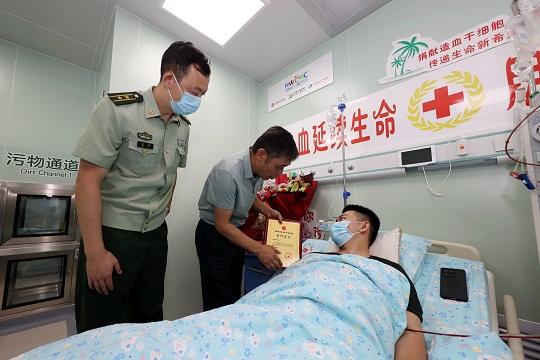 4月6日,海南省婦女兒童醫(yī)學(xué)中心采集室,血液順著針管,從武警海南總隊三亞支隊?wèi)?zhàn)士文濤(化名)的右臂流出,再通過血液分離機(jī)從右腳流回身體。此刻,文濤正靜靜地躺在病床上。