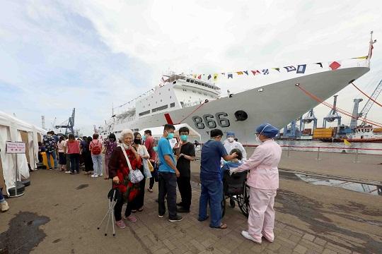 圖為2022年11月11日,“和諧使命—2022”任務醫(yī)療服務在印尼雅加達丹戎不碌港碼頭和“和平方舟”號醫(yī)院船上同時如期展開。蒲海洋 攝