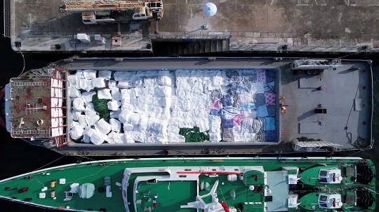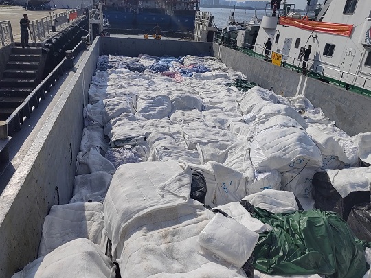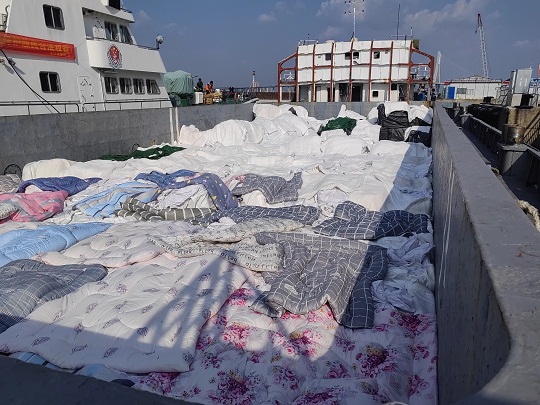 經(jīng)查,該嫌疑船為鐵質(zhì)運(yùn)輸船,駕駛臺后方為貨艙,貨艙內(nèi)裝有白色和黑色塑料編織袋,袋內(nèi)有來源不明的牛肉、牛腩、牛肚、牛筋、驢雜等凍品約485噸,案值約4000萬元,隨船人員均未能提供船上所裝載貨物的相關(guān)合法來源證明,執(zhí)法員依法對該船舶和凍品進(jìn)行扣押。