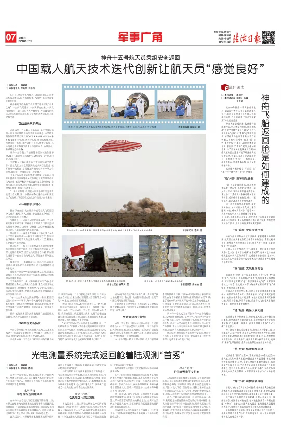 6月4日,神舟十五號載人飛船返回艙在東風著陸場成功著陸,航天員費俊龍、鄧清明、張陸全部安全順利出艙。