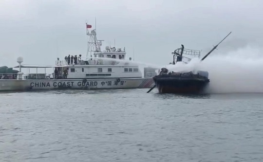 圖為海警執(zhí)法員用高壓水槍滅火。