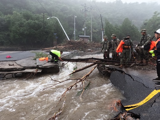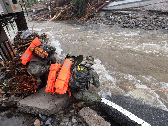 前進(jìn)路上,折斷的樹木和電線桿倒伏在河道,部分路基被河水全部掏空,路面整段塌陷下去。“快點(diǎn),再快一點(diǎn),把情況摸清楚!”朱鵬宇和戰(zhàn)友們在沒過小腿的洪水中加速挺進(jìn)。