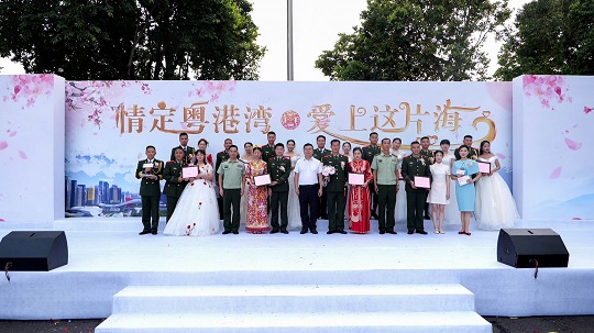 “愛意翻山渡海,終抵良人身畔。今天我們在此,和天空,和海疆,和艦艇一起見證這11對新人人生最重要的時刻。”隨著愛情的煙花在天空綻放,幸福的汽笛在海疆長鳴,熱烈的鑼鼓在廊道敲響,11對新人在親友和來賓的祝福中從海警艦艇緩步走向“情定粵港灣·愛上這片?!奔w婚禮的舞臺。