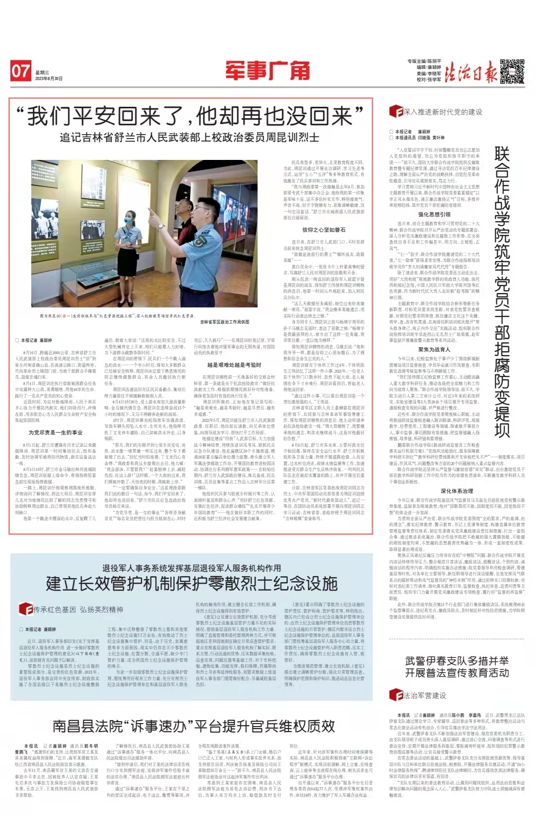 日前,吉林省軍區(qū)黨委批準周昆訓同志為烈士,中央軍委國防動員部黨委為周昆訓追授優(yōu)秀共產(chǎn)黨員、“新時代最美國動人”,追記一等功,在國防動員系統(tǒng)部署開展向周昆訓同志學習活動。吉林省委、省政府授予周昆訓同志“吉林楷模”榮譽稱號。