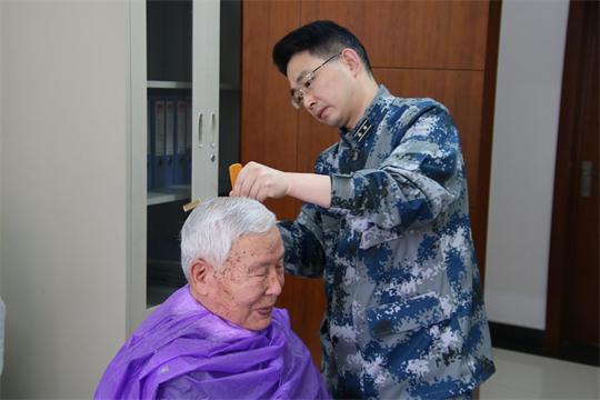 圖為周昆訓(生前)服務保障為老干部剪頭。吉林省軍區(qū)政治工作局供圖