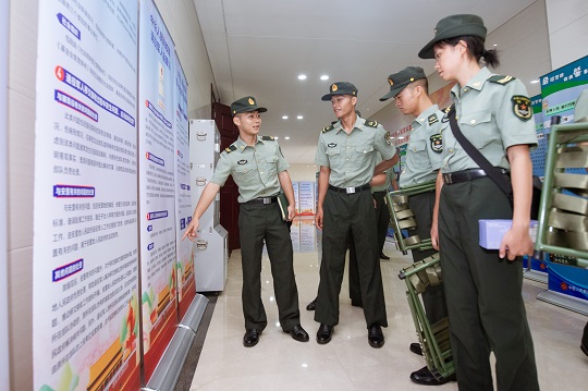 圖為官兵觀看法律法規(guī)宣傳展板。