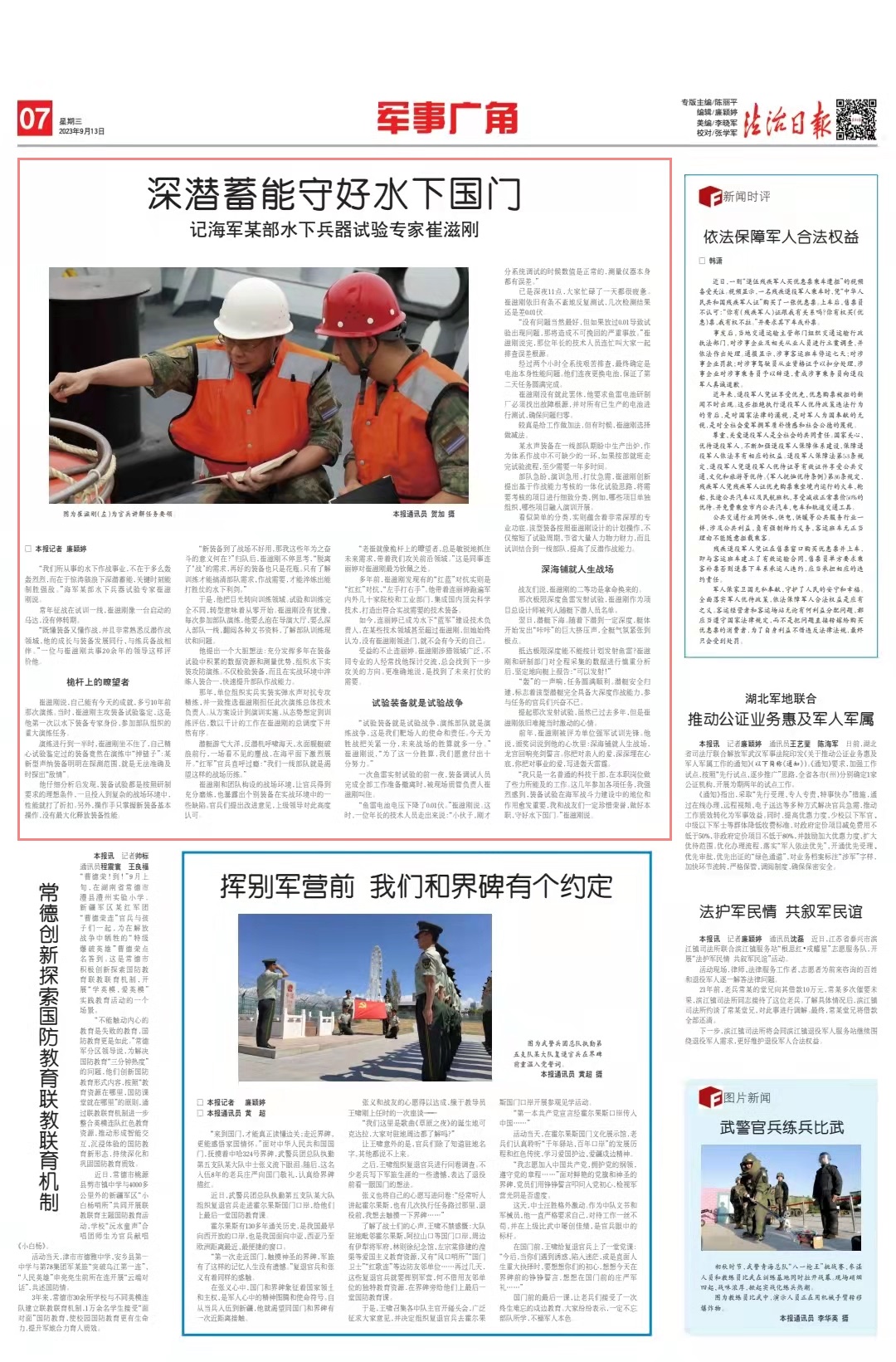 “我只是一名普通的科技干部,在本職崗位做了些力所能及的工作。這幾年參加各項任務(wù),我強烈感到,裝備試驗在海軍戰(zhàn)斗力建設(shè)中的地位和作用愈發(fā)重要,我和戰(zhàn)友們一定珍惜榮譽,做好本職,守好水下國門?!贝拮虅傉f。