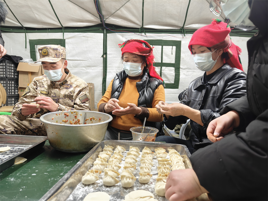 12月22日是冬至,武警青??傟?duì)炊事員們和海東市民和縣中川鄉(xiāng)老鄉(xiāng)一起包餃子。大家一邊包餃子一邊聊天,有說有笑,現(xiàn)場充滿溫情。