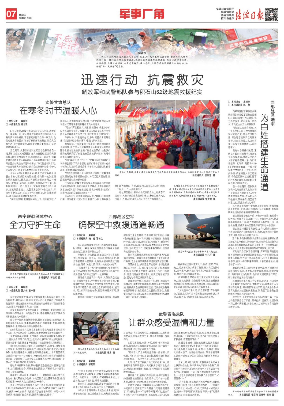 積石山6.2級(jí)地震造成重大人員傷亡,房屋、水、電等基礎(chǔ)設(shè)施受損,解放軍和武警部隊(duì)官兵第一時(shí)間奔赴現(xiàn)場抗震救援。他們以最快的速度組織搜救,想方設(shè)法排查險(xiǎn)情、救治傷員、打通生命通道、安置受災(zāi)群眾。這個(gè)冬天,人民子弟兵用溫暖人心的行動(dòng),詮釋著“為人民服務(wù)”的宗旨。