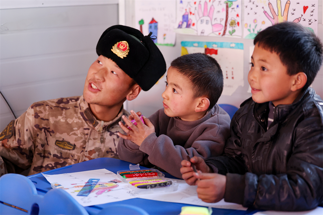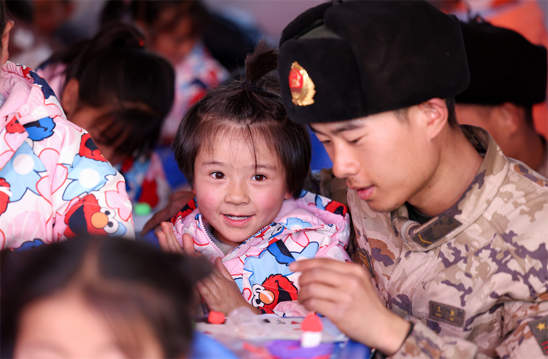 圖為武警甘肅總隊(duì)臨夏支隊(duì)官兵在甘肅省積石山縣劉集小學(xué)臨時(shí)教學(xué)點(diǎn),帶著孩子做手工喜迎新年。侯崇慧 攝