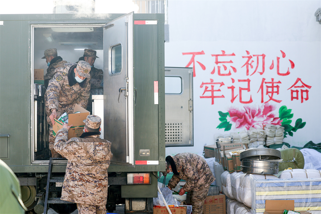受災(zāi)地區(qū)海拔較高、天氣寒冷,官兵在臨時(shí)帳篷外搭鍋支灶,提供熱食保障?!拔覀冞@次出動(dòng)的炊事車叫‘野戰(zhàn)移動(dòng)廚房’,哪里有需要,我們就把車開到哪里?!憋嬍潮U戏株?duì)指揮員說。