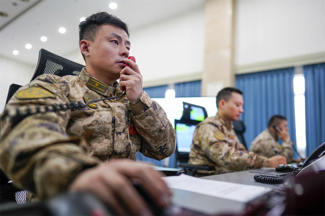 圖為西部戰(zhàn)區(qū)空軍某中心航管參謀正在對(duì)受災(zāi)區(qū)域空域進(jìn)行飛行調(diào)度。付興平 攝