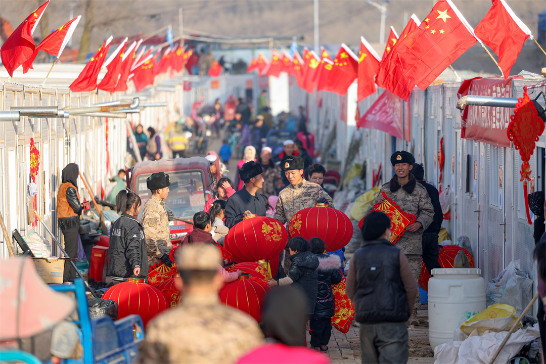 圖為元旦期間,武警甘肅總隊(duì)臨夏支隊(duì)官兵在積石山縣劉集鄉(xiāng)陽屲村,為臨時(shí)安置點(diǎn)村民送去燈籠和中國結(jié)。侯崇慧 攝