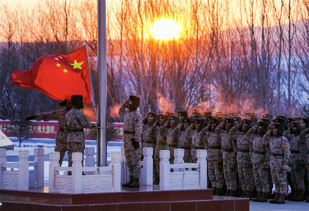 近日,駐守在黑龍江省撫遠(yuǎn)市黑瞎子島的陸軍某邊防旅“東方第一哨”官兵迎著祖國第一縷朝陽,升起鮮艷的五星紅旗。